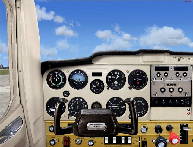Das virtuelle Cockpit der C152 sieht ihrem Original erstaunlich ähnlich. Alle Funktionen, Instrumente und Hebel funktionieren und sind sehr realitätsnah (z.B. der Drehzahlmesser). Die Hebel und Schalter lassen sich sowohl mit den Tastenkombinationen als auch mit der Maus bewegen, beziehungsweise umschalten. Ausserdem ist der Transponder realistisch, er lässt sich auf vier verschiedene Werte setzen (OFF, STBY, ALT, ON). Was mich im VC massiv stört, ist, dass sobald man in ca. einem 45 Grad Winkel auf die Instrumente schaut, diese z.T. massiv verzerrt werden. Die Frequenzen können zudem nicht mit den Knöpfen verstellt werden, sondern man muss mit der Maus über das Display fahren um die Frequenz zu ändern.