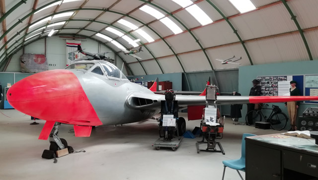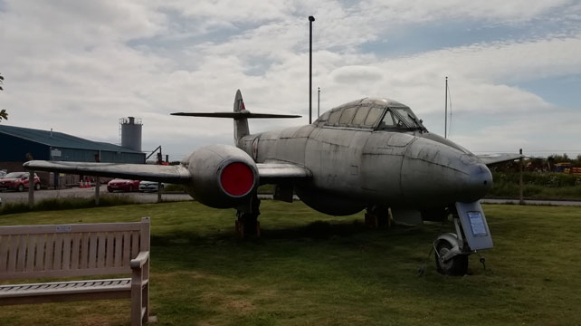 Der Gloster Meteor war das erste Strahlflugzeug der britischen Royal Air Force, er wurde sogar in geringer Anzahl im Jahr 1945 während dem Zweiten Weltkrieg eingesetzt. Mit dem Meteor wurden nach dem Krieg auch einige Geschwindigkeitsweltrekorde errungen. Das Ausstellungsexemplar wurde im Jahr 1951 gebaut und diente bei der Royal Air Force bis 1959. Der Meteor war ein gefährliches Flugzeug, 890 Flugzeuge stürzten bei den britischen Luftstreitkräften ab und nicht weniger als 450 Piloten kamen dabei ums Leben. Allein im Jahr 1953 stürzten 145 Meteor Jets ab.