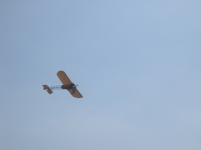 Dank des Denkmalschutzes schaut auch noch der Reichsadler von der Backsteinwand auf die Besucher, nur das Hakenkreuz hat man ihm aus den Krallen geschlagen. Zurück zum Flugplatz, ich muß mich beeilen, denn eine der Sensationen steht an, ein Bleriot-Eindecker von 1909 soll im Flug zu sehen sein. Die Maschine kommt aus Schweden und hat noch den Original-Umlaufmotor von 1909 und fliegt ohne Ruder, nur durch Verwinden der Tragflächenenden gesteuert.